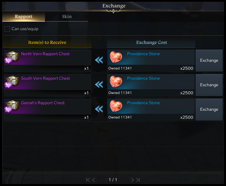 Another way to consistently obtain Rapport Items is through Exchange Rapport Vendors in every continent. These vendors allow you to buy region specific Epic Rapport Chests for 2500 Providence Stones each. These chests contain random Epic to Legendary Rapport Items native to the specific continent that players bought them in. Items from those chests will generally be more preferable for NPCs in the same zone, yielding higher Rapport points.
