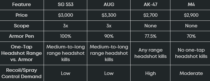 Pros often steer clear of the SG 553 and AUG and prefer the AK and M4 more. This is mainly because of the higher price tags, slower handling times, and the necessity to ADS. The AK and M4 simply offer more versatility for aggressive plays, especially in top-tier level coordination. More so, these pros have probably spent countless hours mastering spray control for every bullet, and the players in low ranks are no comparison to them.