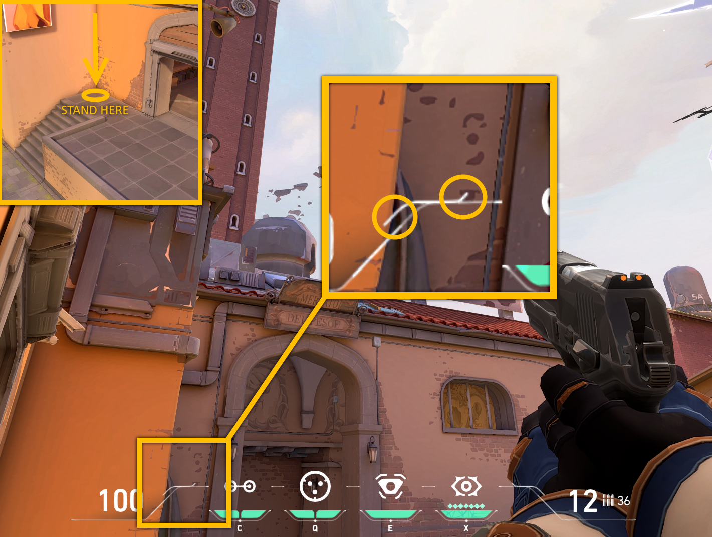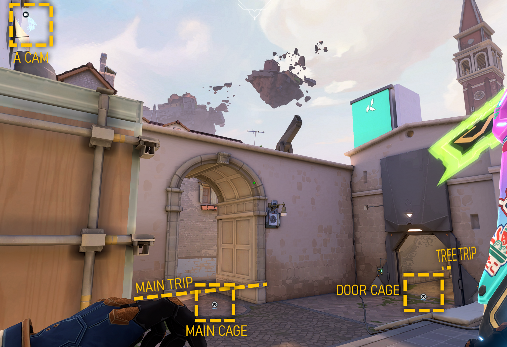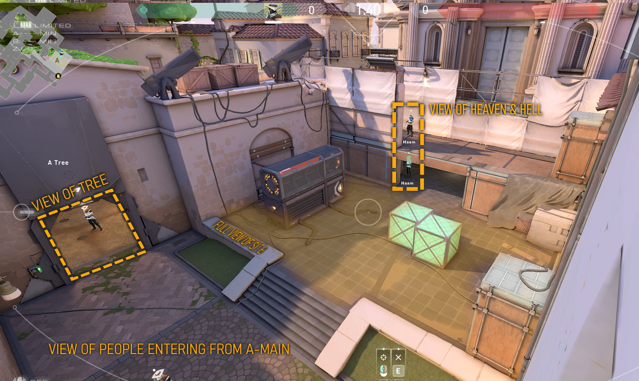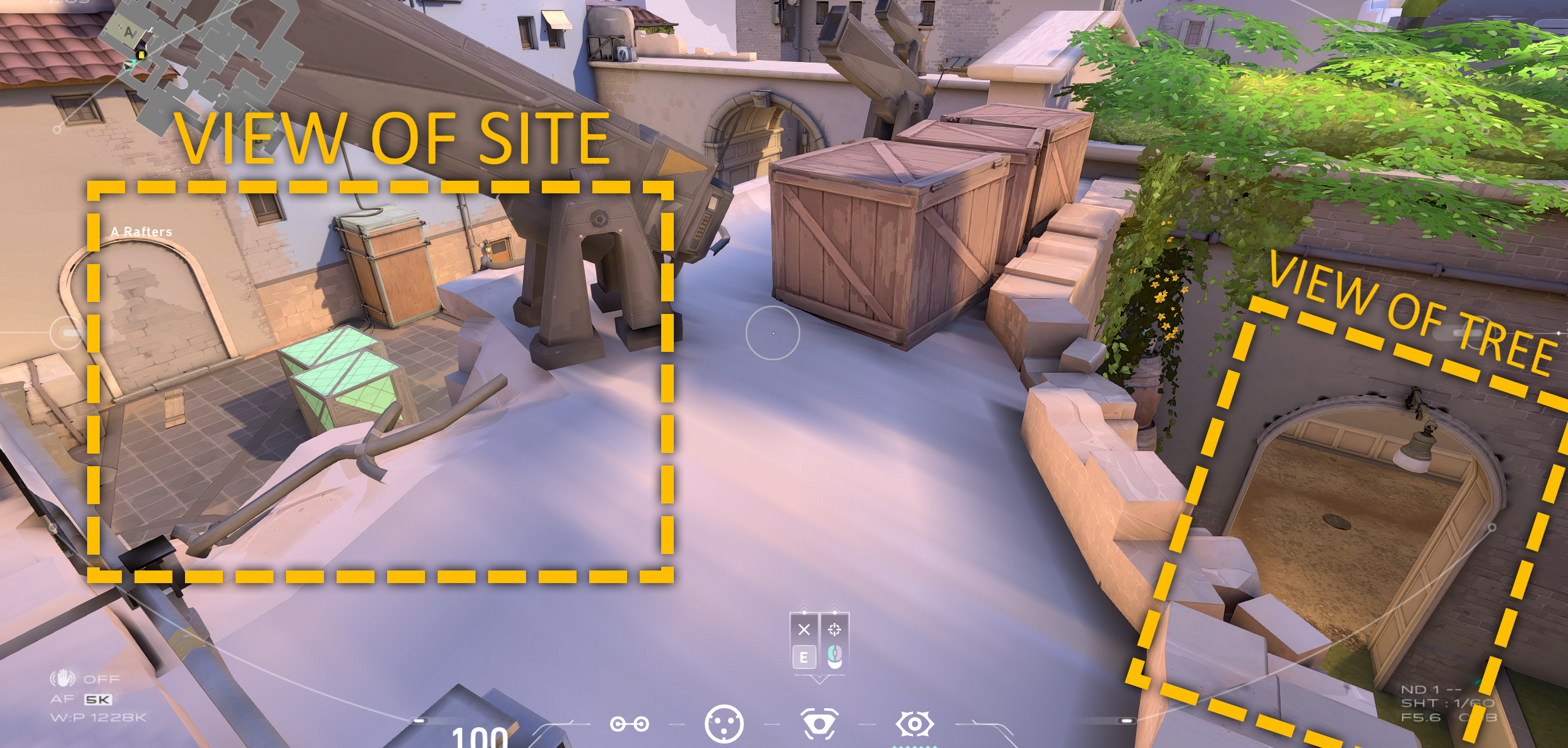 A-Site is a fantastic site for Cypher with the high buildings in the area and the many slanted boxes and structures around the site. There are one-ways for this site but they are pixel perfect and not super viable. Here is an overview of the A-Site setup for Cypher on Ascent.