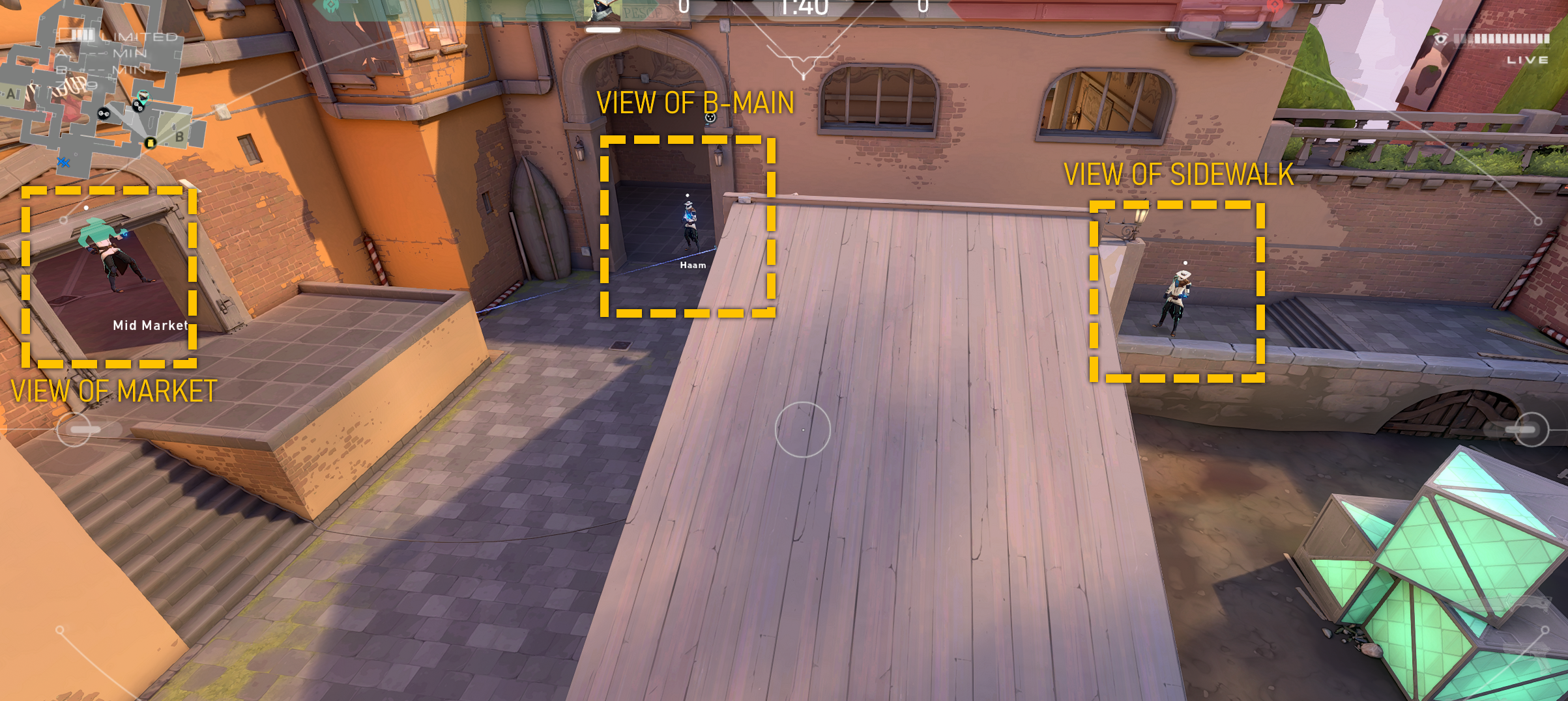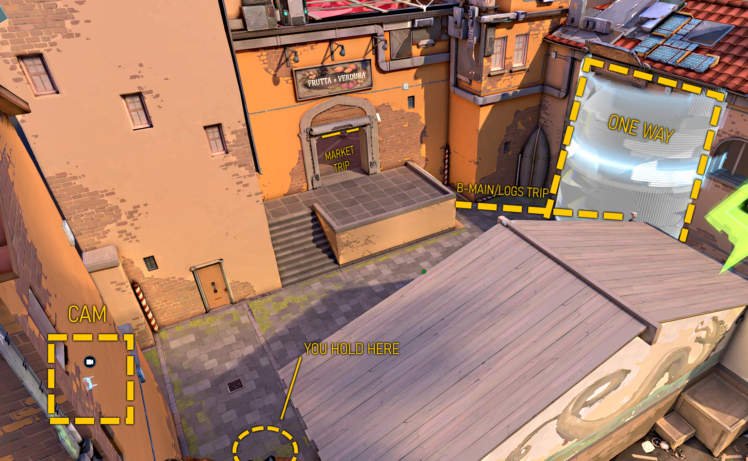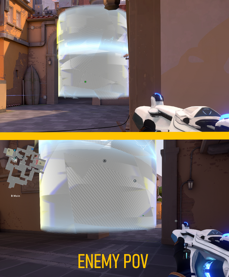B-Site should be the go-to sight you hold on Ascent due to the closed corridors you have to go through to get to the site, whether it is Stairs, B-Main, or Sidewalk. Holding this site is fantastic due to how much B-Main is a chokehold and how hard it is to enter to B-Site. B-Site is also home to an easy-to-execute but extremely deadly one-way that can easily shut down a full push onto site. Here is an overview of the setup.