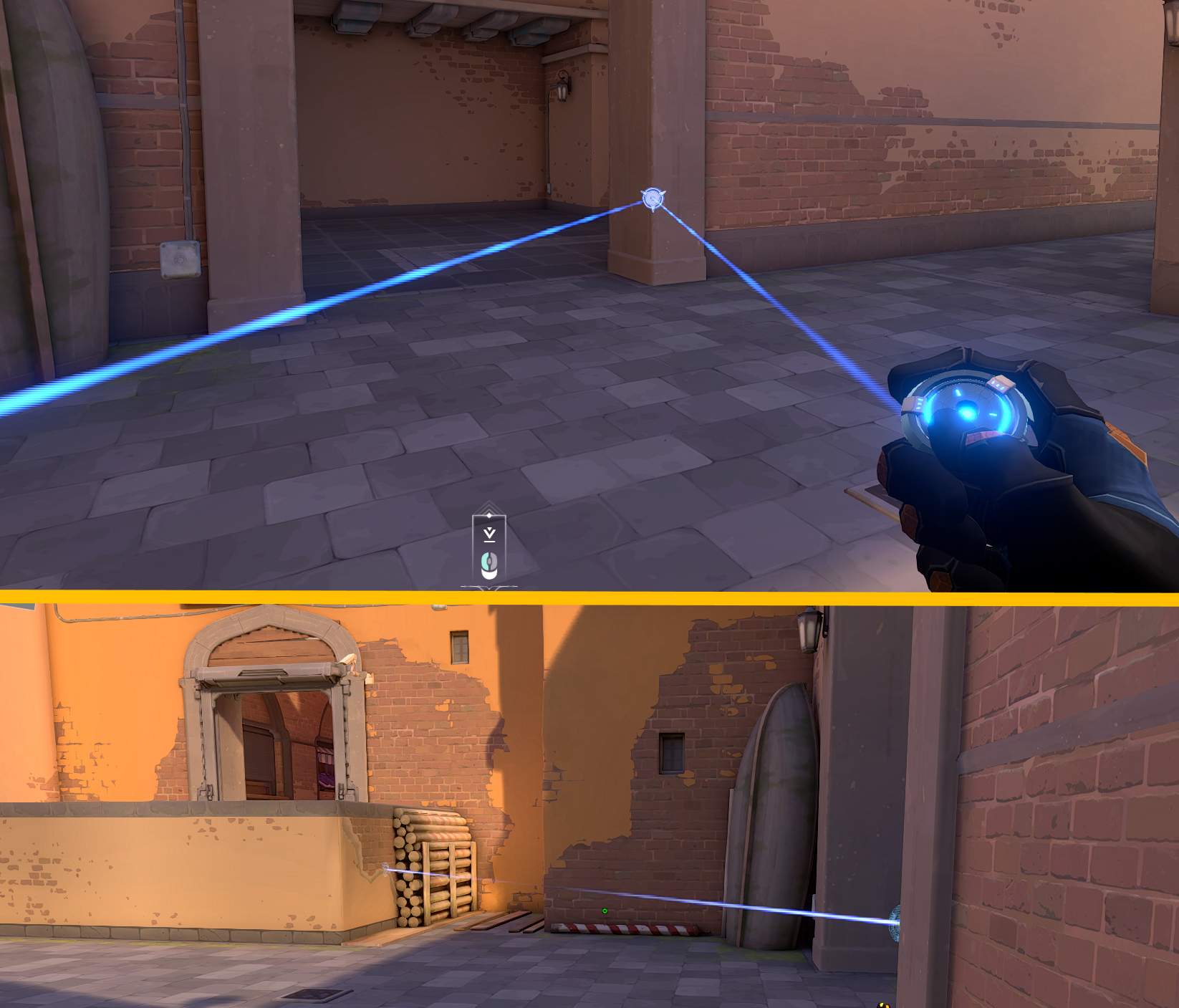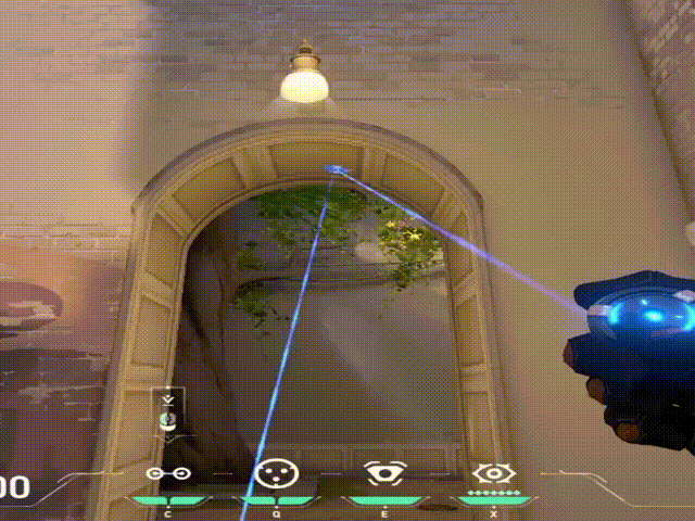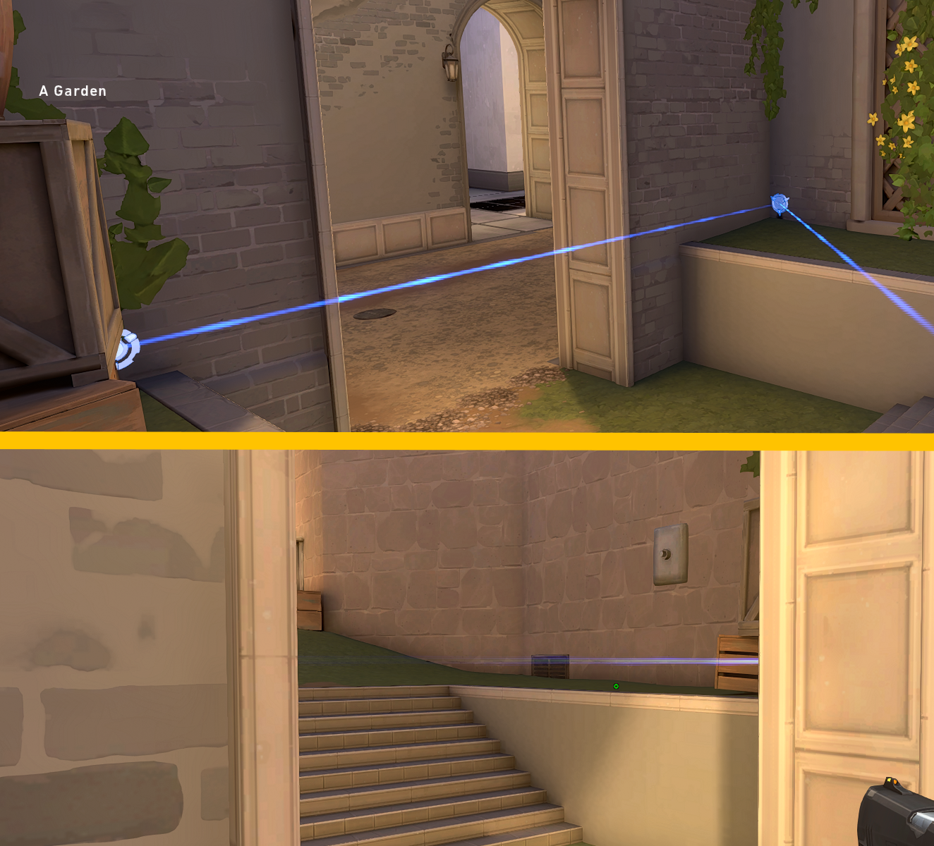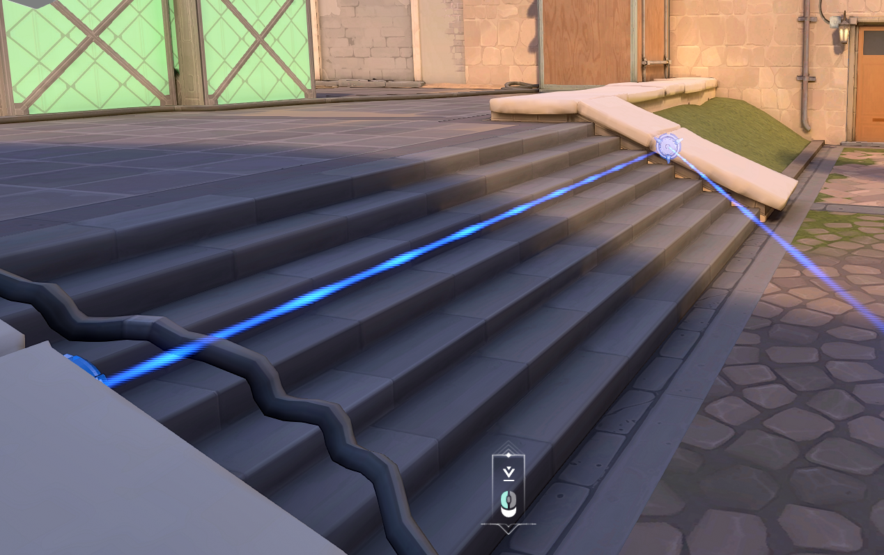 1. - Having your tripwires going past a doorway rather than on it. Having the ends of your tripwire not visible in the doorway affects an enemy pushing through it in two ways. Firstly, it’s harder to see the tripwire (shown below) since the enemy cannot see each end of the tripwire. Secondly, they won’t be able to shoot the tripwire without either walking into the tripwire or going for a wallbang, which completely exposes their location. This method is the go-to method for having an effective wallbang that cannot be countered without a shock dart or Raze utility being wasted to destroy it.