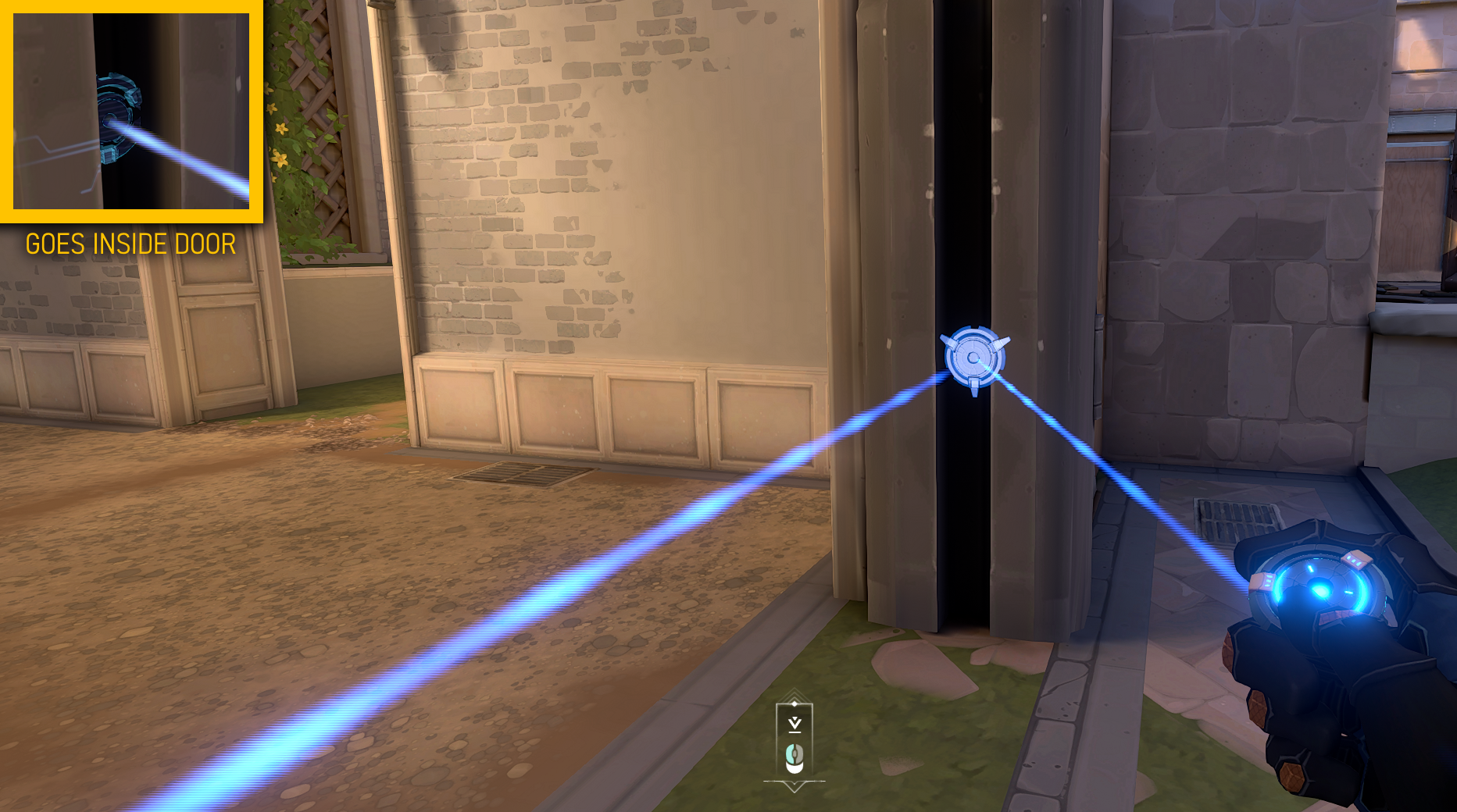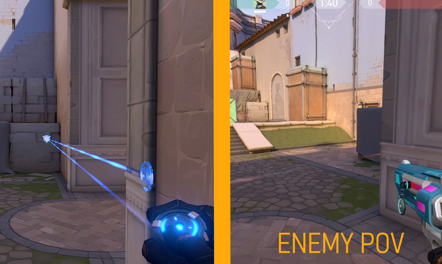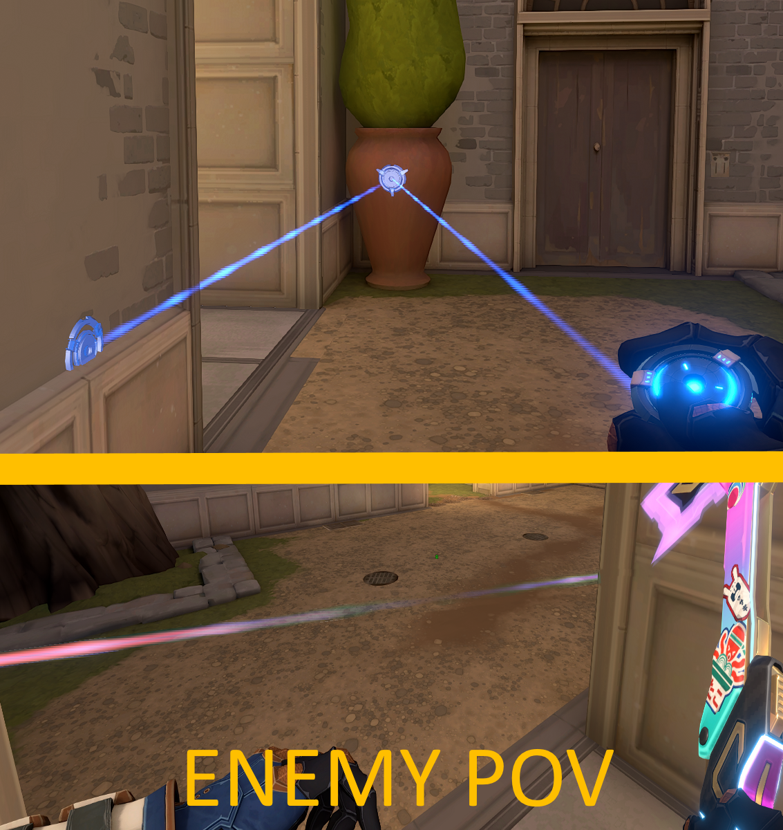 1. - Having your tripwires going past a doorway rather than on it. Having the ends of your tripwire not visible in the doorway affects an enemy pushing through it in two ways. Firstly, it’s harder to see the tripwire (shown below) since the enemy cannot see each end of the tripwire. Secondly, they won’t be able to shoot the tripwire without either walking into the tripwire or going for a wallbang, which completely exposes their location. This method is the go-to method for having an effective wallbang that cannot be countered without a shock dart or Raze utility being wasted to destroy it.