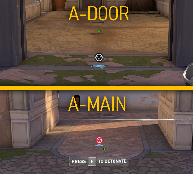 Next up is this sneaky hidden tripwire that goes into A-Door, as you can see this wire goes into the doorframe, being completely hidden. The reason this trip should not be your go-to trip for A is due to the fact that closing the door will instantly destroy the tripwire. Though it still is a clever tripwire if you are an attacker holding post plant, and the door is already destroyed.