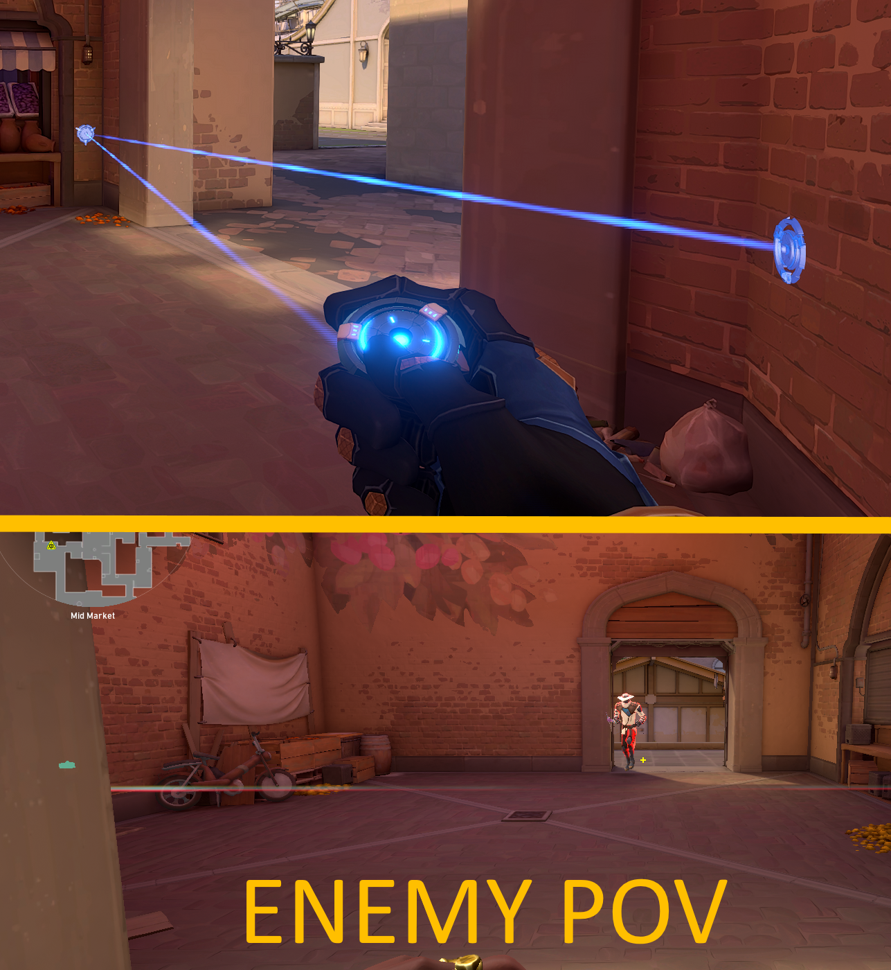 This next tripwire is for people pushing from Middle to Market. Simply just place your tripwire at the left-hand wall next to the fruit till and the other end should land on the slanted wall to the right. This is a great trip because the enemies cannot see the ends of the wire, and cannot shoot it without pushing through it, or wallbanging it at an unusual angle, which can easily be punished.