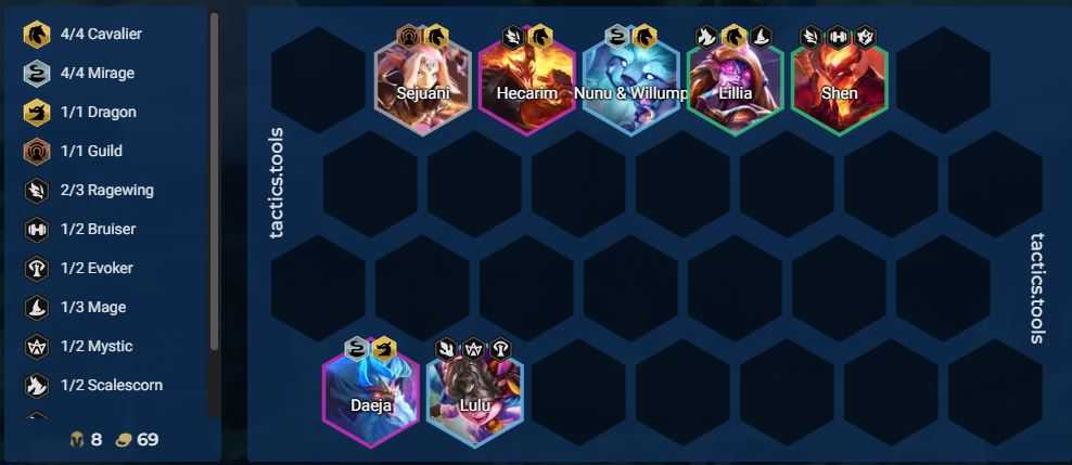 Assuming everything here is upgraded, what would you take out? Lulu and Shen have no synergies, so it might be tempting to drop them, but really consider what your comp is missing. If you’re losing to an AP heavy comp, maybe swap in Mystic over Shen, or add Ornn over Lillia (although your comp becomes much less attractive) for bruiser and more utility. While you don’t need to run all of these units and what you run can vary a lot from game to game, don’t just make changes blindly. Shen can negate an entire spell rotation from Shi Oh Yu, and Lulu gives tons of attack speed to Daeja, so make sure you don’t ignore this.