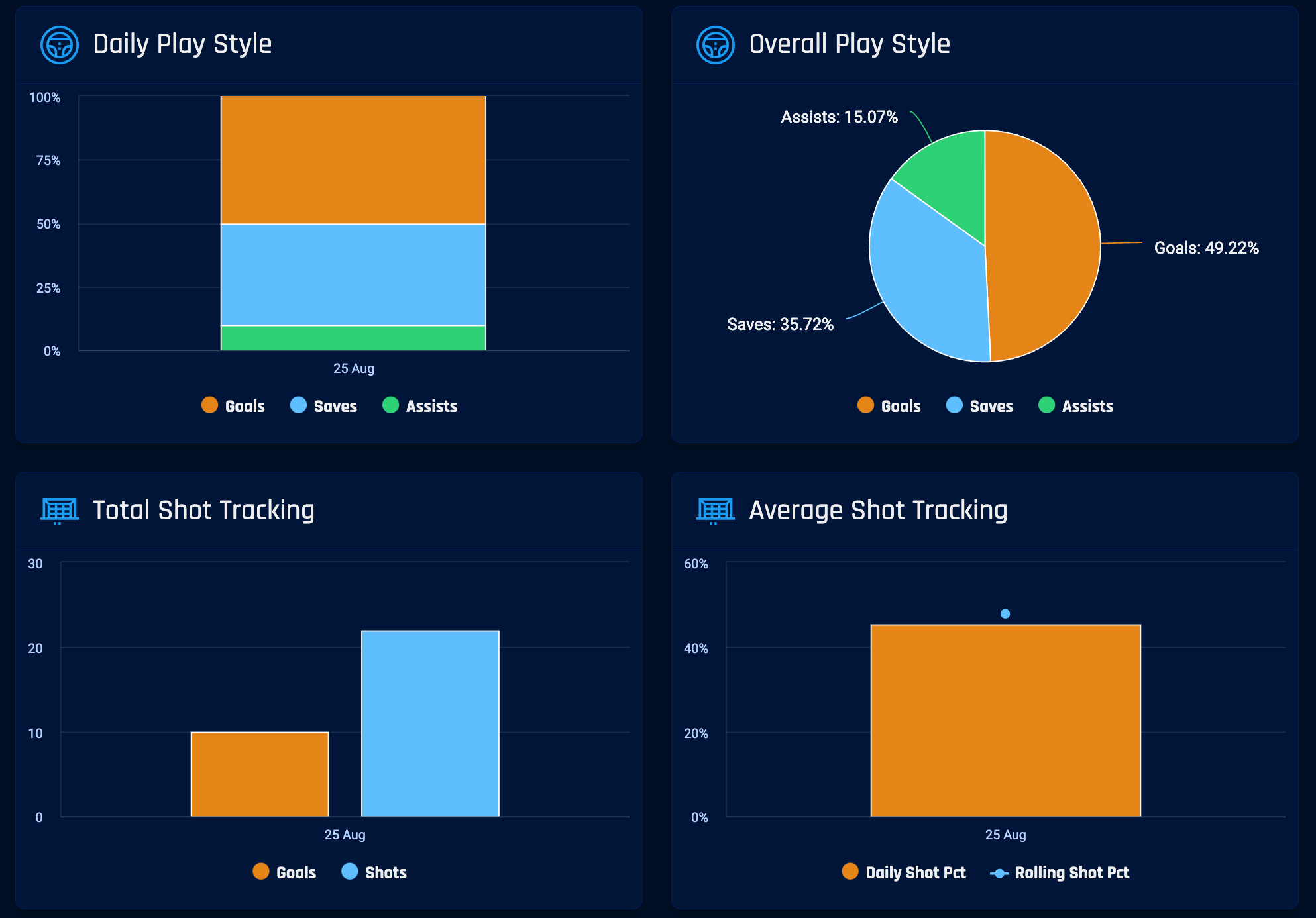 As previously discussed, a playstyle involves using certain skills more often than others. Choosing your personal playstyle requires that you evaluate your strengths and weaknesses and choose a playstyle that best plays to your strengths. However, it is often not that simple, and choosing the right playstyle for you will likely involve some trial and error. I suggest that after you read this, you choose a couple playstyles you like and try them out to see if they work for you. For now, checkout rltracker.org, a website that details your playstyle statistics.
