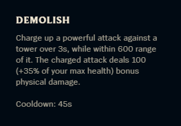 Your split pushers should be champions that can find their way out of a tight spot with ease and present a threat to towers/enemy champs in equal measure. Powerful split pushing champions include (but are not limited to) Tristana, Tryndamere, Camille and Irelia, as each has high mobility and will demolish those towers if given the opportunity. Speaking of Demolish, taking this rune in your build is an even greater way to burn through turrets like they weren’t even there, if you can identify in Champ Select that the enemy’s teamfighting potential far outweighs your own.