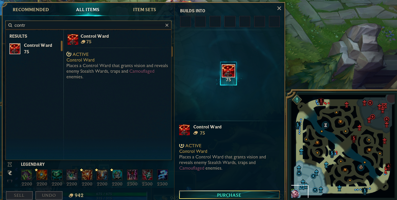 - Buy control wards and place them where the enemy team are likely to path through — be conscious of common jungle pathing and what objectives are up around the map
