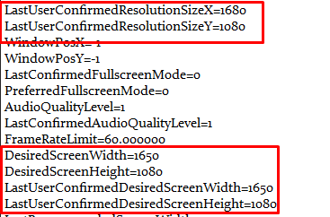 Once you have the config file open, change the values of the following settings to set it to your desired resolution. The settings below are for a 1650x1080 resolution, but you can replace it with whatever resolution you want. To save the changes, press CTRL + S on your keyboard.