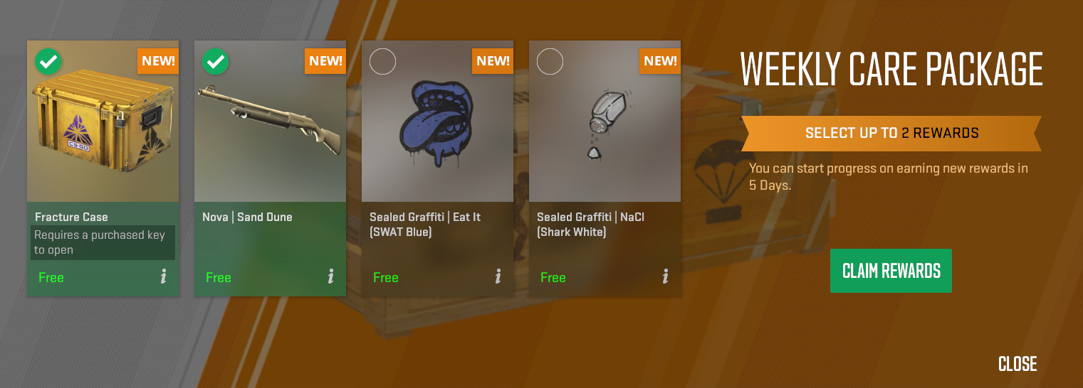 While cases and cosmetic drops have been a part of Counter-Strike for a long time, Valve changed the system when CS2 was officially released in September 2023. Drops now come after you level up for the first time of the week in the form of the Weekly Care Package. This lets you choose two out of four cosmetic items like cases, skins, and sprays. Be sure to play consistently to get the most out of these drops!