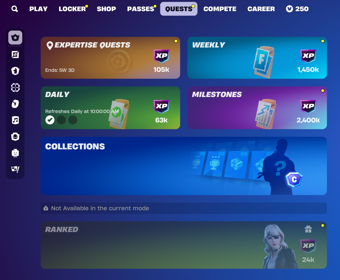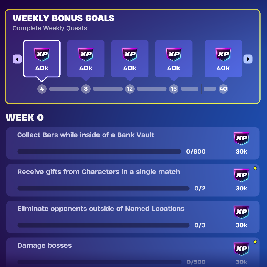 Weekly quests are sets of quests that players can complete each week to obtain a hefty amount of XP. These weekly quests remain in your quest tab throughout the entire season, allowing you to come back to them and catch up on any missed weeks. Now, as the name suggests, these quests typically take around a week (for those who do not play extensively each day) to complete. However, if you take advantage of the quest tracking feature that Fortnite offers and make sure you have a new quest after one is completed, you will start to see your Battle Pass skyrocket towards the higher tiers!