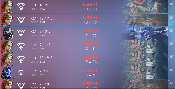 If your match history looks like the image below, then you must be spiraling from being tilted, in a slump, or just burnt out. Together, we can isolate the problem and do our best to manage it, so that our match history can stop looking like this: