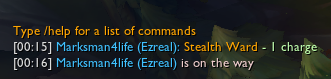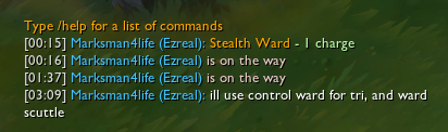 If you want your teammate to ward something, ping for assistance on the bush, or pinging your ward and then the bush for further clarity. This prevent use of chat and delaying the message from having to be typed out, then read by the teammate, and avoiding the chance of the message not even being noticed as pings come with a bright flashing visual and a louder audio cue that will help grab your partner's attention.