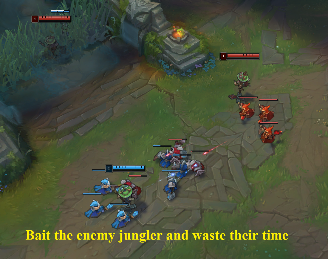 The main objective in this scenario is to waste as much time as possible. While you are wasting their time, your jungler can gain leads by farming camps, counter-jungling or ganking other lanes. Even if you do not have vision of the enemy jungler, you are still exerting a lot of pressure on your lane opponent. This will eventually force a roam or gank from the opponents in order to relieve pressure, which is why it is important to position yourself in this way even when you do not have vision or information regarding the whereabouts of the opposing jungler.