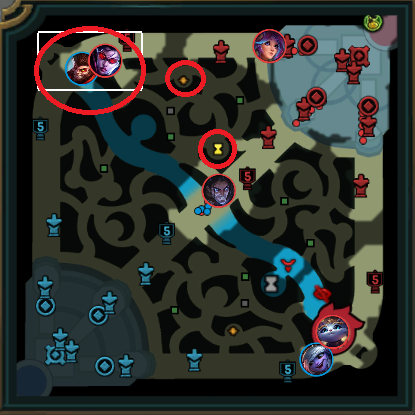 After your first clear, you have a few ways you can look for ganks while still trying to clear. One example can be shown just from this minimap from a recent solo queue game of mine.