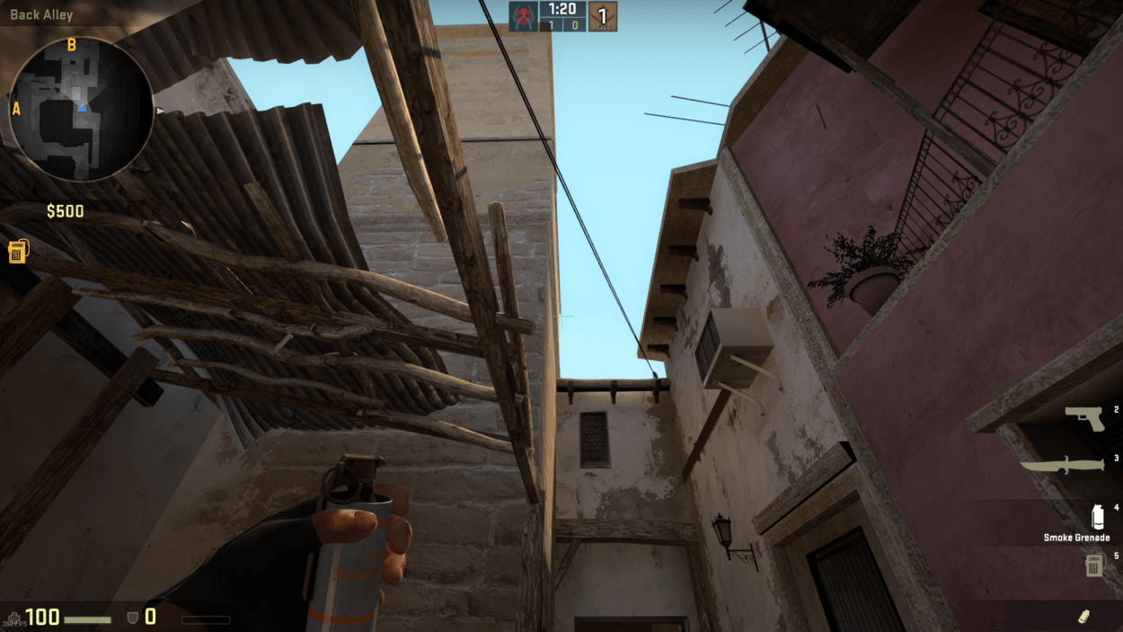 Let go of both mouse buttons at the same time, and your smoke will land in between the Bombsite and Apartments. You can also throw a pop-flash like this, which will blind anyone watching the Van and waiting to pick off the planter from Cat.