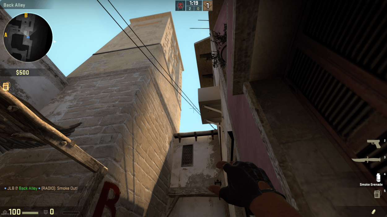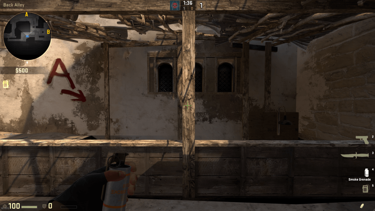 Smoking the Bombsite is very important, since then the counter-terrorists have no view on the planter. This allows him to plant safely, unless a stray bullet kills him, which is unlikely. Just like the Bench smoke, this is very easy to do and reproduce. The first thing you want to do is stand next to the end of the window that is farther from the Bombsite.
