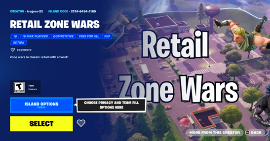 This map spawns players in Retail Row with the storm closing in around them shortly after spawning. Once the game begins, loot will spawn in front of the players to pick up and then jump into the action. The map itself has several iconic parts of Retail Row, with some other added structures as well. This map is perfect for players who are big fans of the location and are looking for some high-action late-game brawling. The island code for this map is 2724-6434-2189.