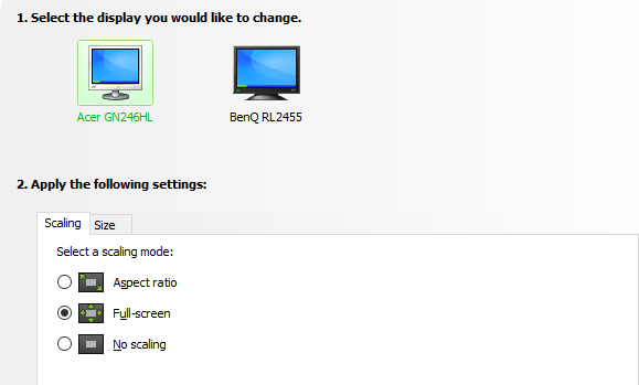 Step 10: After selecting the monitor that you wish to display the stretch resolution, select your scaling mode as “Full-screen.” The full-screen option stretches the desktop to fit on the entire display. Any application will be stretched to fit the desktop regardless of its aspect ratio and resolution by selecting full-screen.