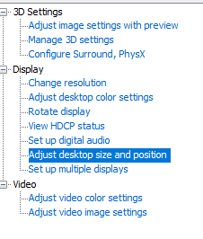 Step 8: Navigate to the DISPLAY section on the left-hand bar in the NVIDIA Control Panel. Under Display, select “Adjust desktop size and position.”