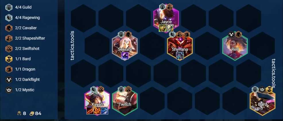 The final point to add is that comps generally have a core, so for this Xayah comp the units you almost always play are Xayah and Twitch plus a Ragewing unit. We ideally want Shyvana, Jayce and Bard usually but those can be flexed out or added later.