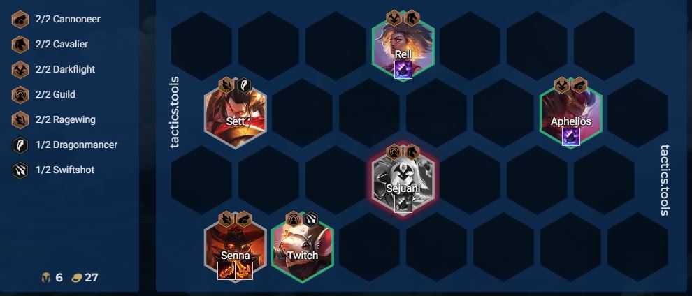 This board is super easy to transition to. We drop the Bruisers as we want Aphelios for Cannoneer, which opens up Darkflight. We then can add a Sejuani to give us a guild bonus and still be sacrificed. Twitch is easy as we want it later and again buffs our whole team. Sett could also become a Rakan or maybe you hit an early Hecarim for 3 Cavaliers. You can also add in a Dragonmancer like Lee Sin which could open up adding an early Graves as well.