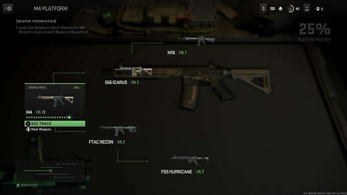 In MW2, player level and weapon level are distinct. In other words, each player has a player level, and each weapon has a weapon level. The progression system also includes Platforms and Receivers which will be explained below.