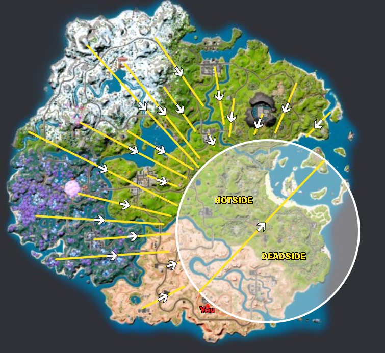 The yellow arrows on the map signify players that have to rotate into the zone. The Hotside is the side of zone that most players will have to rotate into. This means that half of the zone will be highly congested with players. Therefore, if you are positioning yourself correctly, you should be rotating on the Deadside of zone. Deadside is safer because the only teams you have to worry about are the teams that landed in drops inside the first zone.