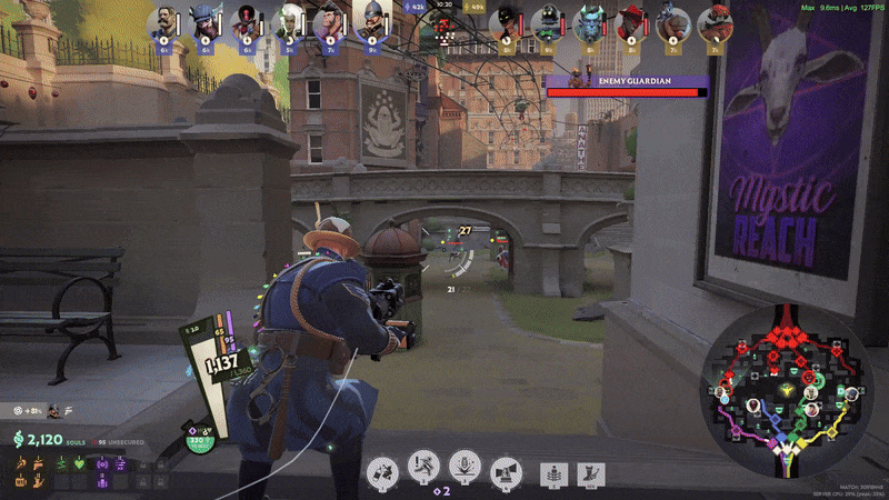 At first, his gun may seem very bad, but Warden’s is unique because its fire rate scales with Spirit Power at 0.22x. His gun starts weak but scales quite well, meaning you only have to suffer through it during the Laning Phase. High-Velocity Mag is a lovely gun item in the Laning Phase to alleviate this weakness, as it speeds up his projectiles while giving you more damage. You can also melee creeps, so you don’t have to worry about the slow projectile speed.