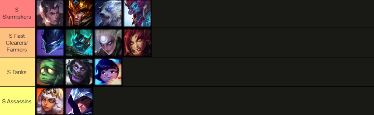 Finally, assassins are able to burst carries on the enemy team and excel through vision control and map movement. If you enjoy the high-risk high reward playstyle of snowballing a game, I’d recommend playing one of the S-tier assassins. Each style of jungling has their S-tier Champions, and it’s up to you as the player to decide what time of gameplay you enjoy most!