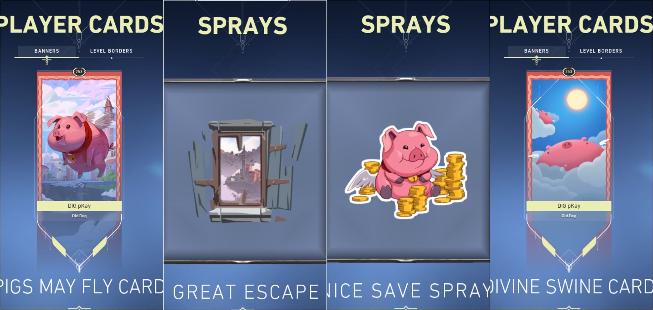 The last interaction with this iconic figure is the Divine Swine skin collection. Another award from the Battle Pass, this collection feature a plethora of angelic pigs flying around one major pig, which can easily be understood as our first escapee.