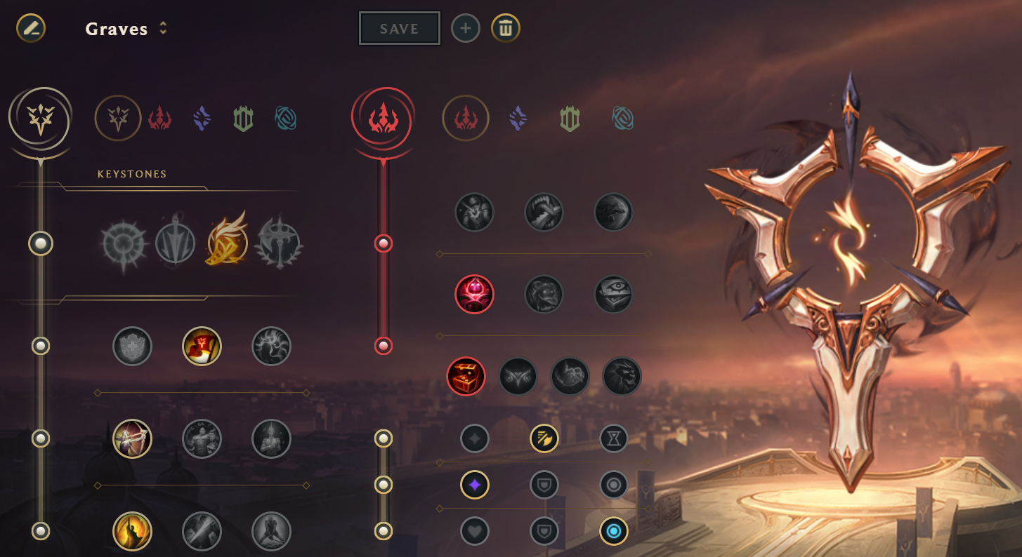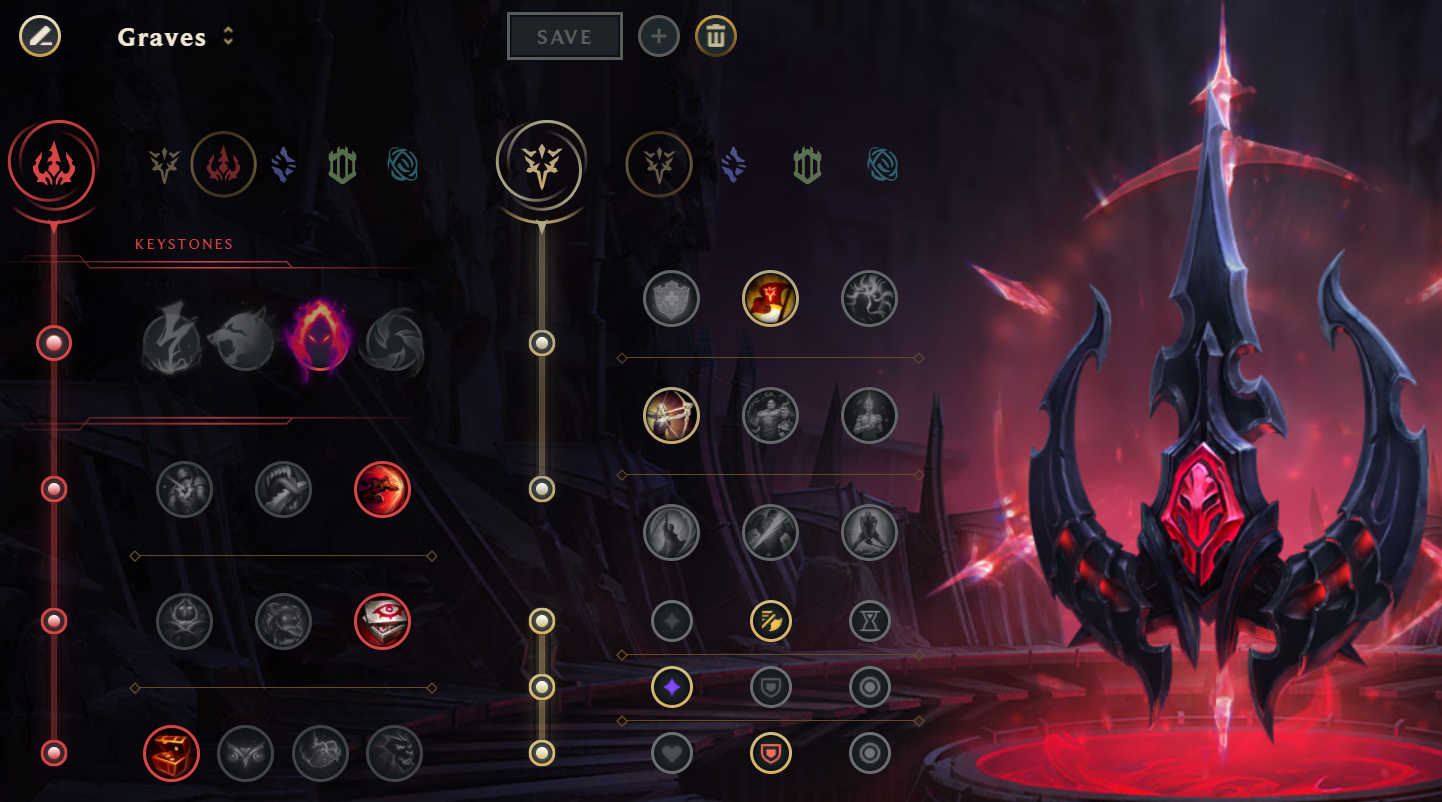 An added perk to Graves jungle right now is that he has a few options for Rune setups. Depending on the drafting phase, Graves can choose to go with the more standard Fleet Footwork setup or go for a more feast-or-famine, early game hypercarry option in Dark Harvest. With Graves’s relatively low cooldown dash, he can already be an overwhelming Champion to slip away from. If necessary, Graves can swap Runes away from Flash and towards other (traditionally considered unorthodox) options like Ghost, Ignite, or sometimes Exhaust.