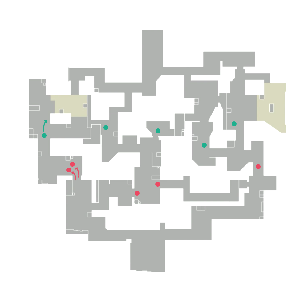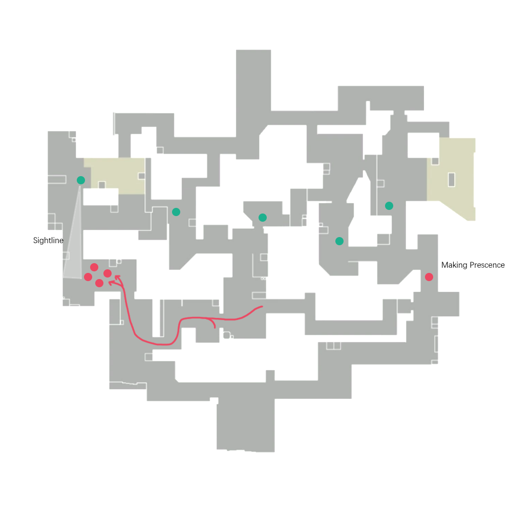 Let’s take a look at a similar example, but this time with the attacking team driving the game. Immediately, the attackers show presence in A Lobby, Mid, and B Main. The A player and the Mid players are playing passively, applying pressure without overextending. In B Main, the two attackers apply enough pressure to force the defending player back onto site. This gives the attackers control of B Main.