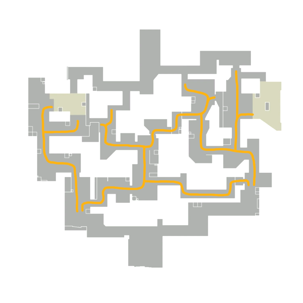 A tangible way to understand the designated zones of each map is to think of “lanes” from attacker spawns to sites. Taking another look at Split, we can draw some lines to show the different paths attackers can take to sites:
