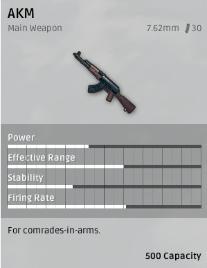 The AKM's base stats are the highest out of all the ARs that can be found, with high base damage (power) but lower stability. These stats are quite good since you can reduce the stability of the weapon in multiple ways but you can't actually increase the damage of the weapon since that damage is bound to the ammunition that the weapon uses. The effective range is the same on every AR, so just ignore that statistic. Firing Rate is not really something you immediately notice in-game, but the AKM's fire rate is lower than all of the other ARs.