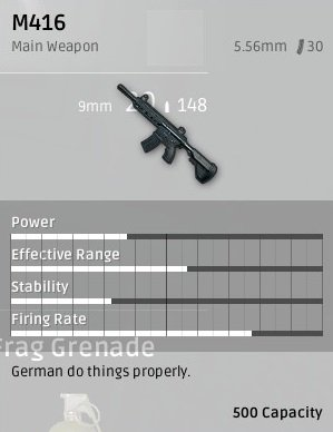 The M416 is a weapon that's the automatic version of the M16A4 but hasn't been nerfed yet while the M16A4 has. The base damage of the M416 is a bit lower but the firing rate compensates for that since it can empty magazines more quickly, making it better for taking down multiple enemies at the same time. The stability of this weapon in practice is a lot better than the statistics may show since the M416's spray pattern is different compared to the AKM's.
