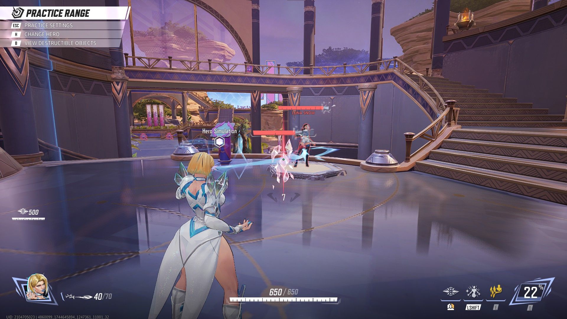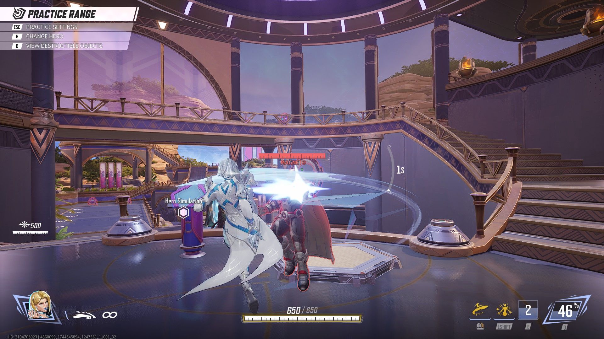 For her base form, her normal attack, Telepathic Pulse, fires a beam similar to Scarlet Witch and Cloak's normal attacks. Frost's normal attack deals more damage the longer it is used against an enemy character, indicated by the number located below the reticle. This damage amplification decreases over time if she does not hit an opponent within 3 seconds.