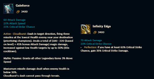 These items are typically the best part of any kit, providing some of the greatest gold-efficient value in the game. Gold efficiency can be a tough concept to define, but we’re simply talking about the value that an item can give based on its stats compared against its cost. Below are two items, Galeforce and Infinity Edge, side by side so that we can analyse the difference in their gold efficiency.