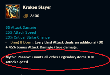 Mythic passives are a new inclusion to League of Legends, as they have come with the categorisation of items into tiers of quality (starter, basic, epic, legendary and mythic). These passives, attached to each Mythic Item, grant the wearer extra stats based on how many legendary items they own. Kraken Slayer provides one of the most impressive mythic passives, giving all other Legendary Items 10% attack speed, becoming a first choice for many different ADCs that can scale well into the late game and continue providing value as more Legendary Items are built.