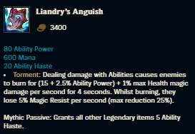 The first and most simple way to understand which Mythic works best for you is by considering the similarities certain Mythics share with previous core components of your build. There are some Mythic Items within the game that have almost directly replaced previously existing items that were removed at the start of season 11; the best example of this would be Liandry’s Anguish replacing Liandry’s Torment. Liandry’s Torment was primarily built for the passive burn it applied to ability damage, and Liandry’s Anguish accomplishes the same goal to greater effect.