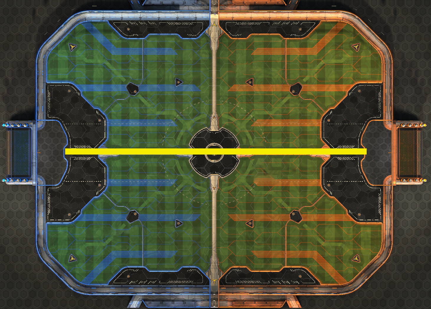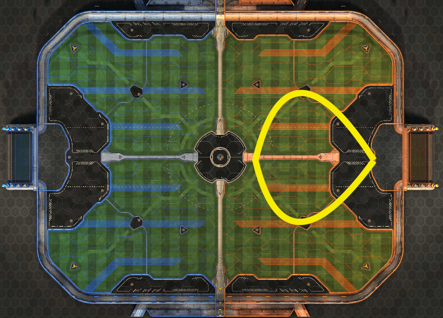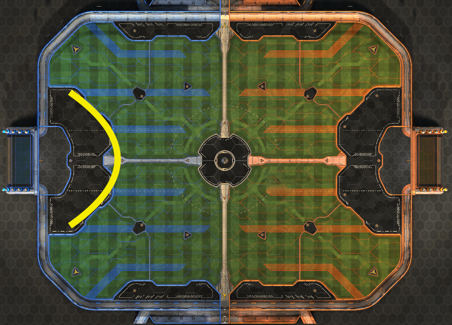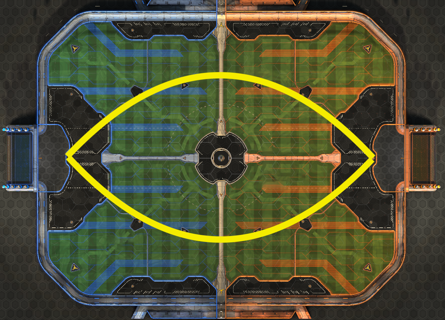 The center of the field is where most of the play in the game takes place, and as such knowing the optimal pathing through it serves two purposes: firstly, you can ensure that you keep up your boost count without leaving the play for a big boost, and secondly, you can deny your opponent from doing the same thing. The pictured boost path, vaguely resembling an American football, represents the most common route for advancing upfield while maintaining a high boost total. This route is perfect for maintaining rotations, keeping you in the play while allowing you to stay fueled for sudden changes. Knowing this route inside and out can deny your opponent midfield pressure through taking pads and possession. This central boost rotation route is one of the most popular for a reason, and if you are yet to leverage it, it is a crucial tool to add to your arsenal.