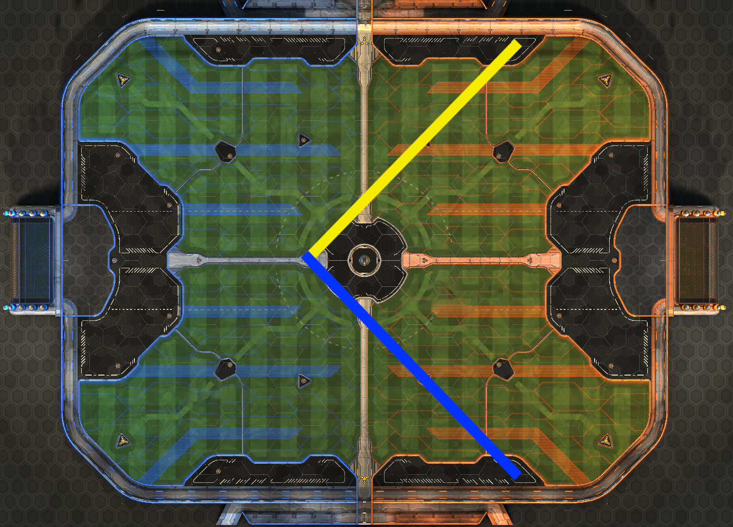 Especially when you are not in possession of the ball, switching sides of the field is rather common. You may need to cross over to be in position for a pass, or to pressure an opponent who is bringing the ball downfield. Big boost pads are notably absent from the center of the field, so this makes optimal pathing even more crucial. Crossing the field by tracing these boost pads towards the center can allow you to space optimally from your teammates as well, to avoid double commits and give yourself both optimal offensive and defensive coverage. As you can recall from the straight path down the middle, straight lines are the fastest way to move across the field, so following these straight lines of boost across the field can make sure that you have enough boost to make plays while getting you all the way to the other side of the pitch.