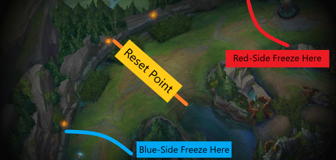 Once the wave bounces back to the middle (orange on image) and the waves have basically reset to the original point where the game starts, you have two options: Either continue farming hopefully getting the wave to push in on you to freeze it in your favor or once the wave has crashed on tower before it bounces back to the middle resetting it, back and buy items because it will take a while for minions to get to your tower and for that laner to either get turret plating or even back themselves.