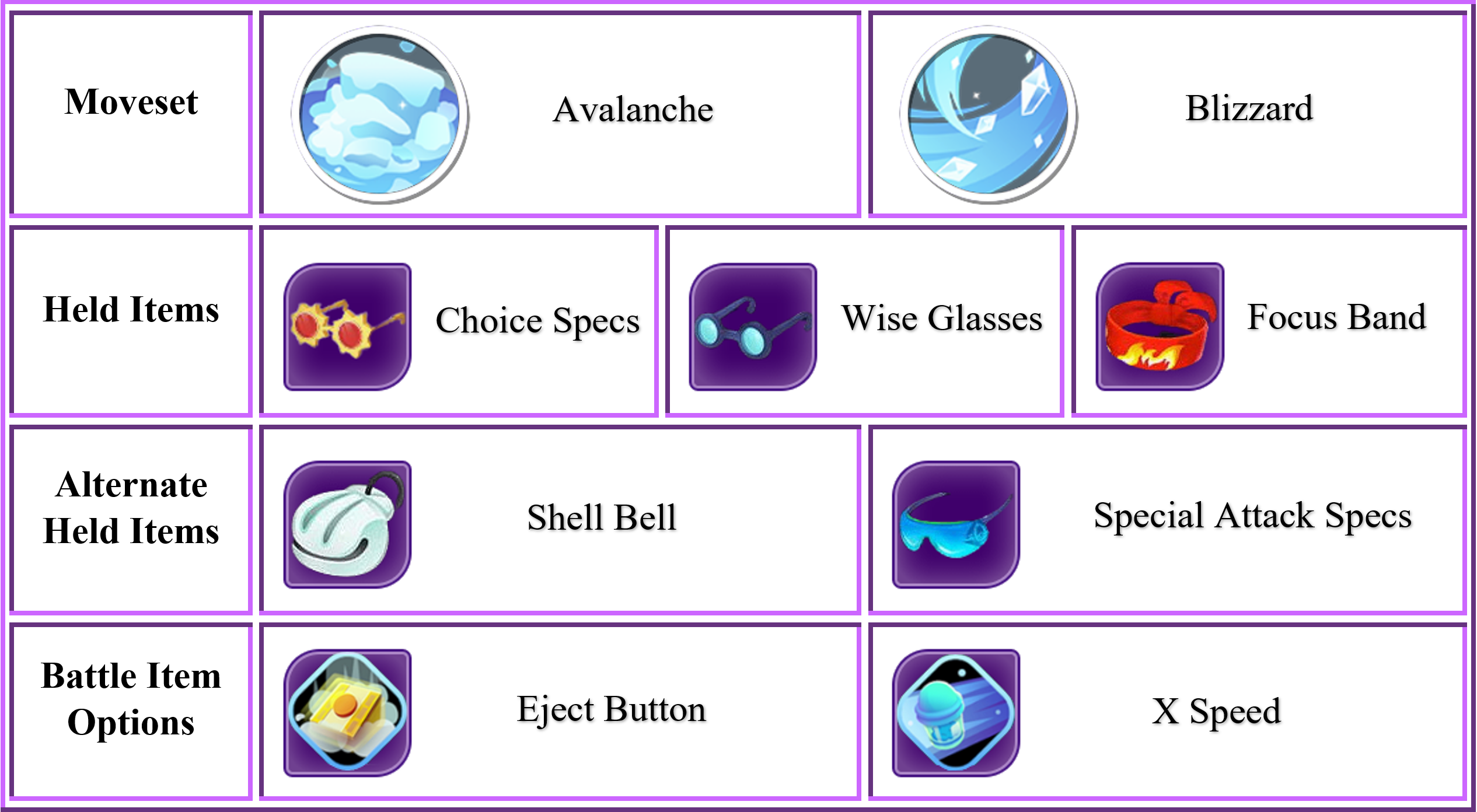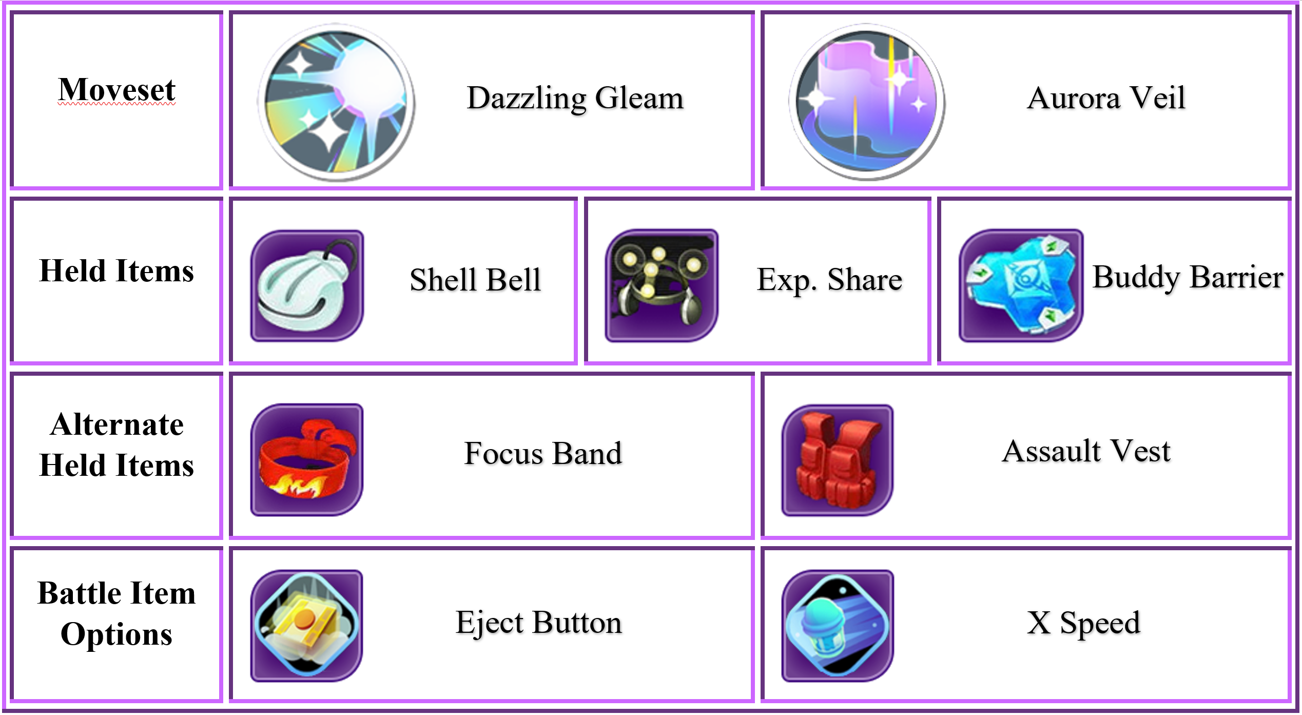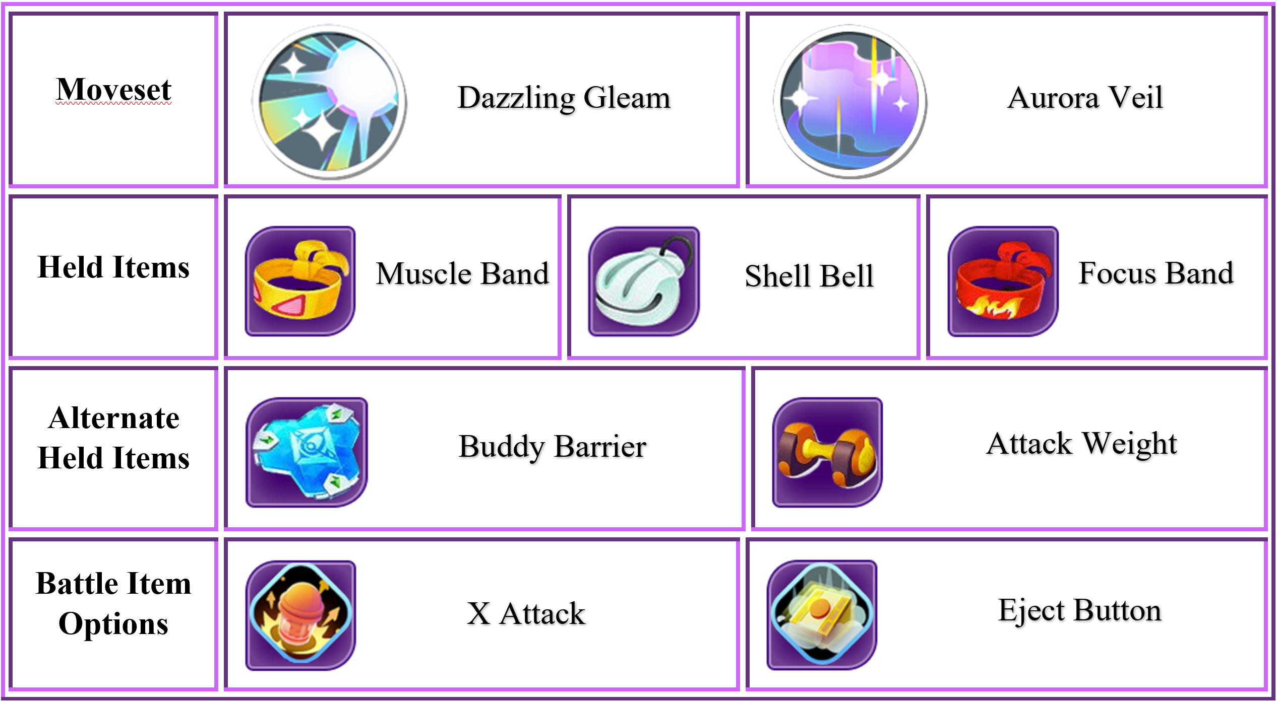 These three items are difficult to substitute, but if absolutely necessary Buddy Barrier can replace Focus Band in defensive value. If you would prefer to utilize a third offensive item instead, then Attack Weight can lean even harder into your reliance on your Standard Attacks, whereas Choice Specs and Wise Glasses are more standard options for Ninetales’ damage. For Battle Items, Eject Button is still incredibly useful, but risk-prone players may consider using X Attack for increased damage output. Coordinating your X Attack with your Aurora Veil buff can yield devastating results in the arena, however, be keenly aware that this option limits your already lackluster mobility severely. Stay close to your teammates and keep a wary eye out for potential ambushes if you go down this route!