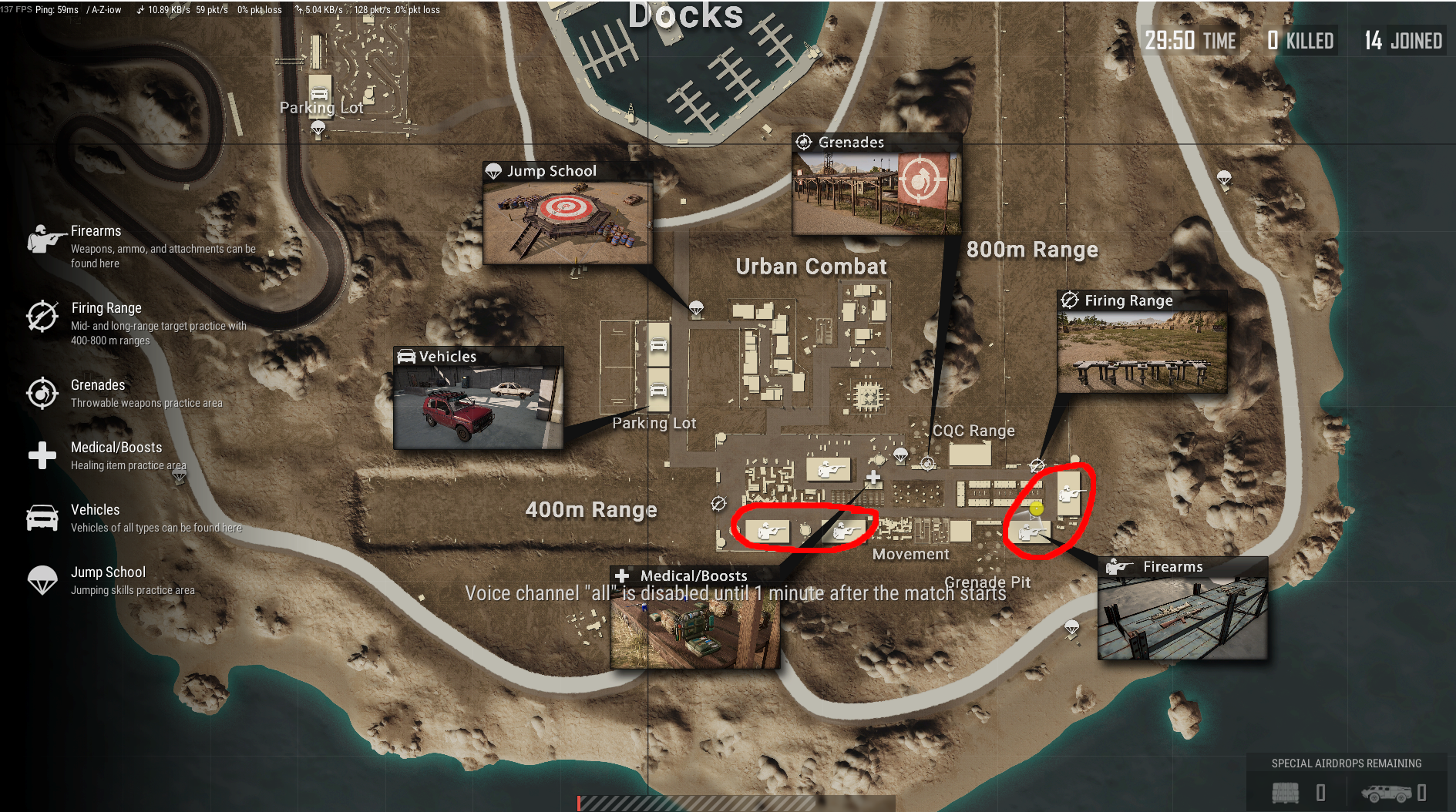 Fortunately, PUBG has a dedicated training map, the perfect place for honing your skills. Especially as a newer player this should be your go to spot for aim training and warming up. To get there, select the PLAY button in the upper left and then click TRAINING MODE beneath it. Once you load in, hit your map button and head to one of the warehouses with the “firearms” logo (circled in red below).