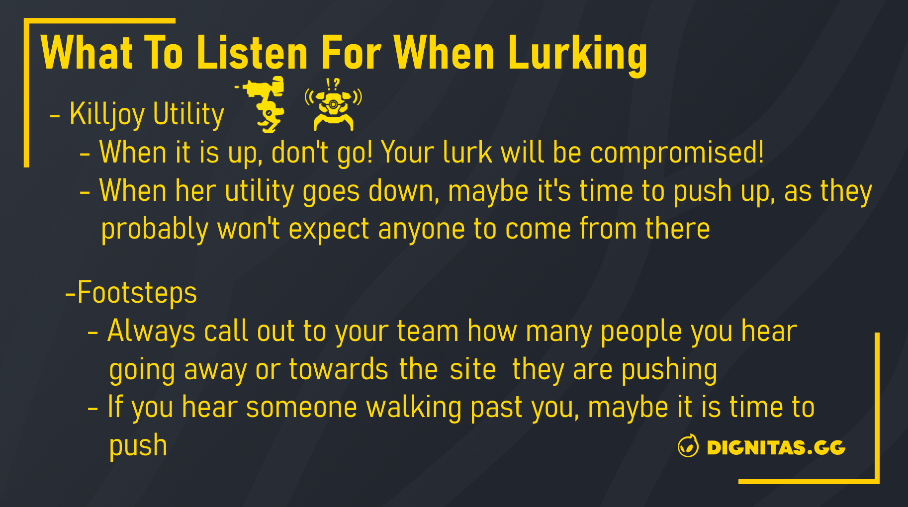 Now once you feel like it has been enough time, begin to slowly walk out towards the middle, now what? Once you walk up the middle, do some more waiting. I know, I know, don’t worry, it gets good in a bit. While waiting, make sure to listen for every single piece of info you can get and communicate it to your team. Your primary job as a lurker is to get info. Keep listening for important sounds like Killjoy’s utility going out of range, and footsteps.