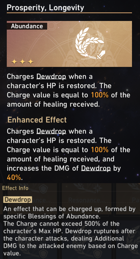 The most important Blessing that players need is ‘Prosperity, Longevity’, as it serves as the team’s primary source of damage. This Blessing enables characters to accumulate ‘Dewdrop’ charges through healing received, which can be discharged as additional damage every time they attack. If players do not obtain ‘Prosperity, Longevity’ before the second Elite Domain, it is recommended to restart the run as further progression may be challenging.