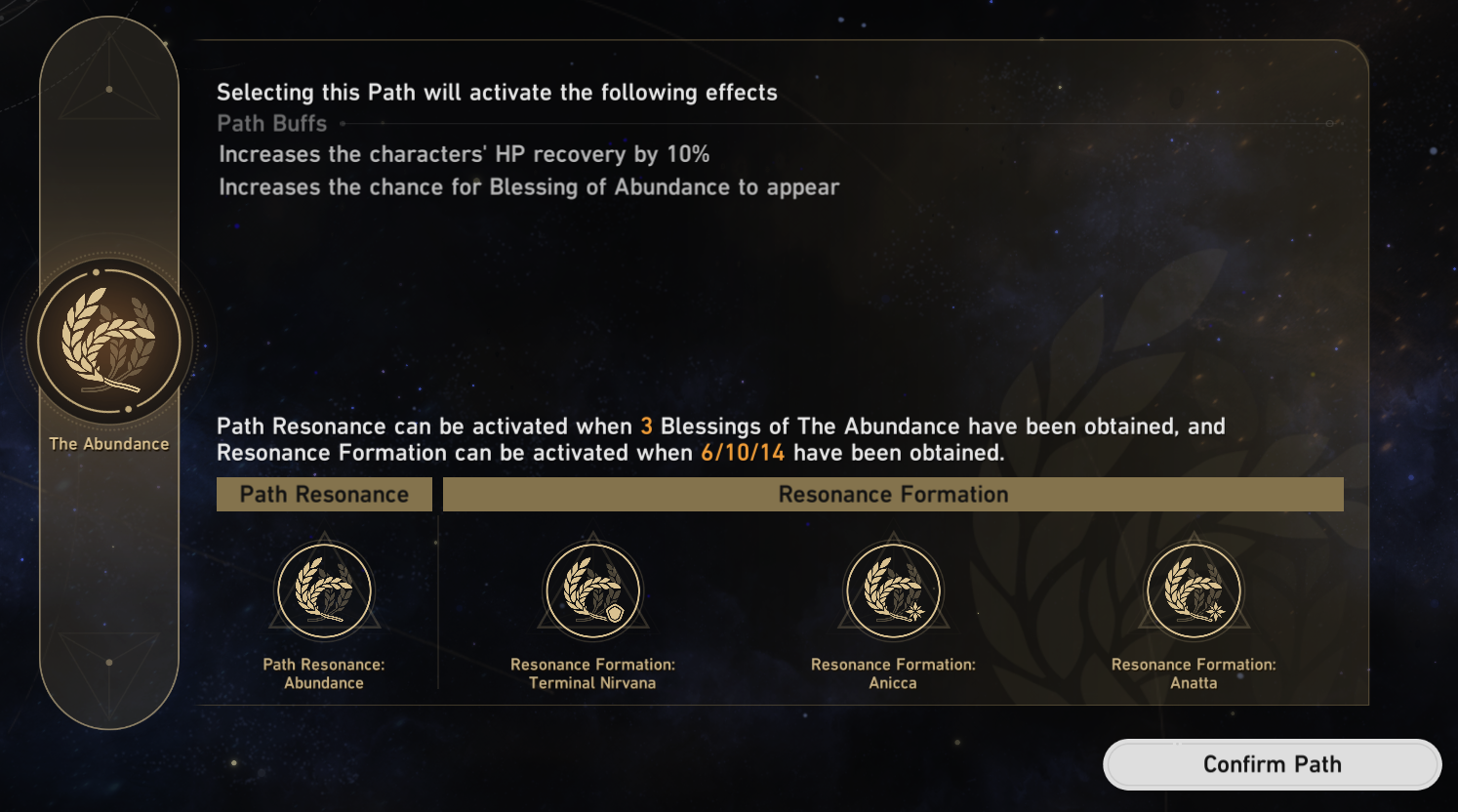 It is important for players to aggressively reroll for Abundance Blessings, as the second Resonance Formation choice requires 10 Abundance Blessings to unlock. In the early stages, regardless of their usefulness, Abundance Blessings should be prioritized until both Formations are unlocked. It is recommended to choose Anatta first and Anicca second.