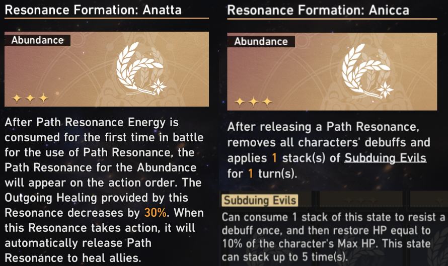 The two Resonance Formations that players will be aiming for are ‘Anatta’ and ‘Anicca’. Anatta enables the Path Resonance ability to enter the Action Order at 70% healing effectiveness after its first use in each battle. This provides the team with consistent healing every turn and is extremely powerful in conjunction with Anicca. Anicca adds a Debuff cleanse and a stack of Debuff immunity, for one turn, to the Path Resonance ability. This combination is key to negating Cocolia’s Freeze effects and stacking AoE damage.