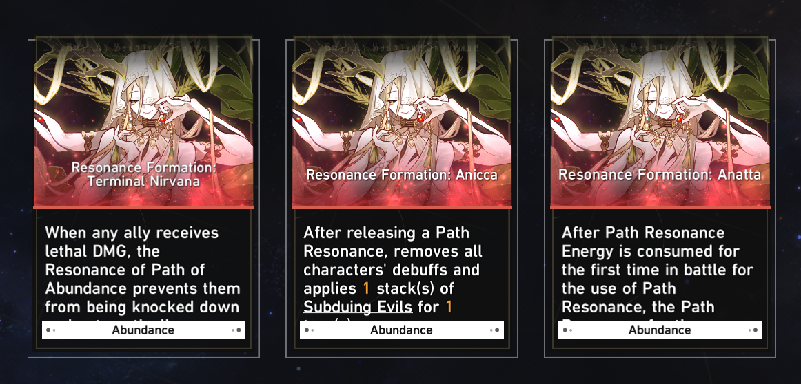 Cycling Path Resonance, in combination with Anatta and Natasha, ensures that buffs from Abundance Blessings and Anicca are always active, such as ‘Precious Moon-Like Candlelight’, ‘Dispel Disaster’, and ‘Victorious Force’. It is particularly important to make sure characters are topped for the damage reduction from ‘Clear Lucite Body’ before incoming big abilities from Elites and Cocolia.